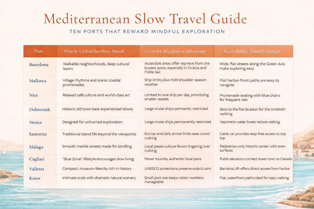 The table below highlights ten representative ports that best illustrate how slow travel principles work in practice. Extra ports covered in the article offer similar benefits, but with different cultural or geographic nuances.