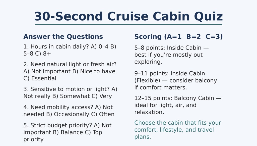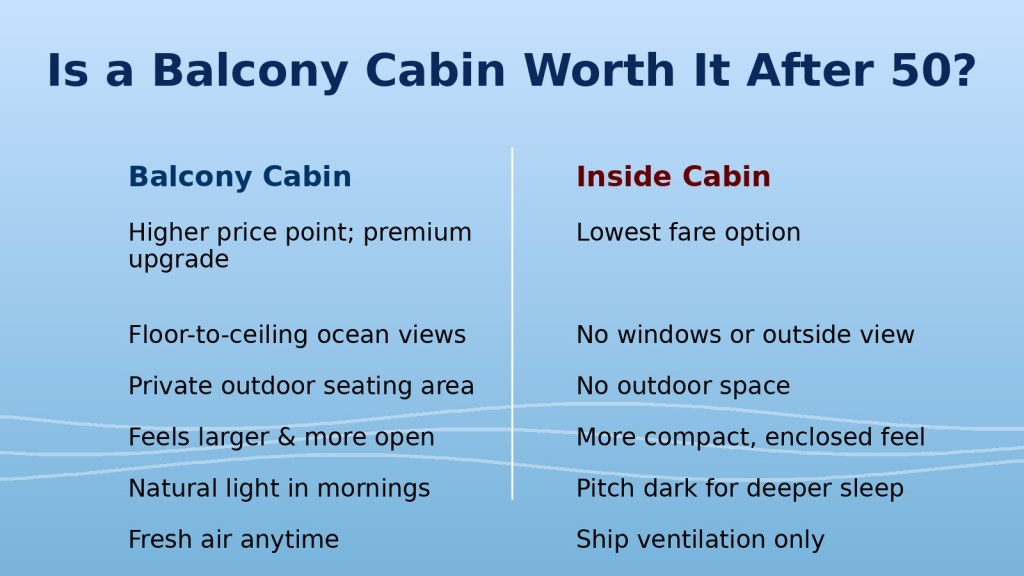 After 50, cruising becomes less about squeezing in everything. It focuses more on comfort. Ease and small details make travel enjoyable. Choosing the right cabin plays a bigger role than many travelers expect. Here’s how to decide between a balcony and an inside cabin. Consider what matters most: sleep, mobility, budget, health, and how you plan to spend your time onboard.